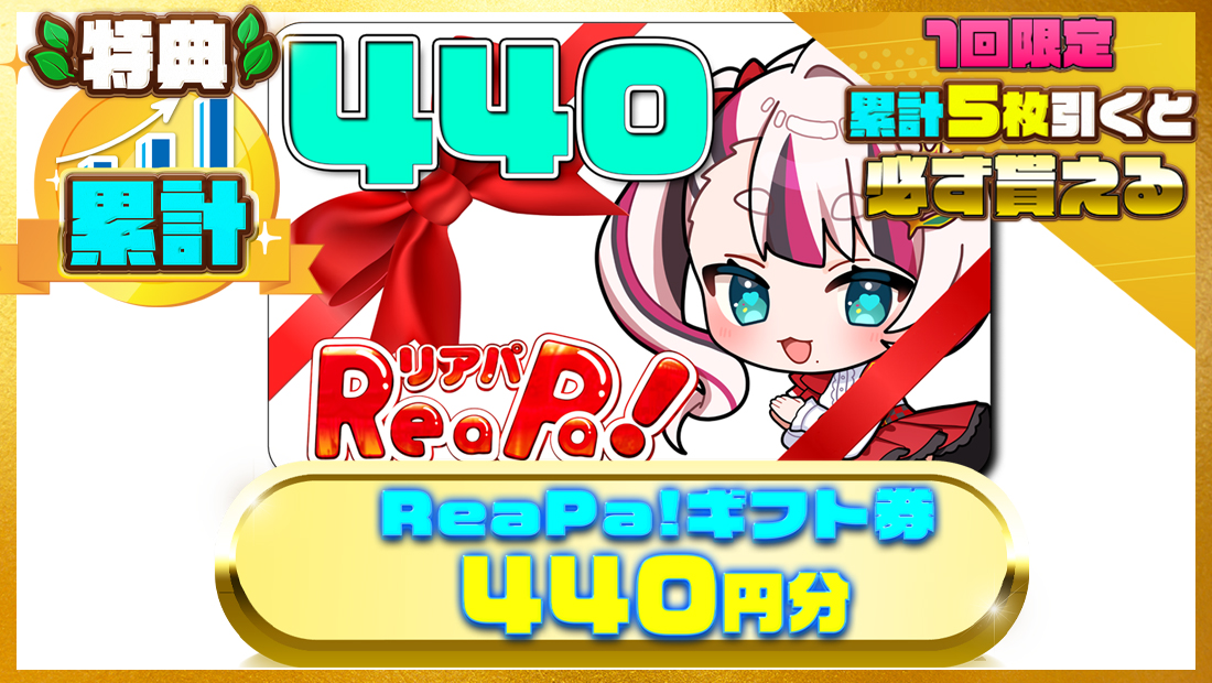 くじを累計5枚引くと1回限定で【ReaPa!ギフト券440円分】が必ず付いてくる!!
