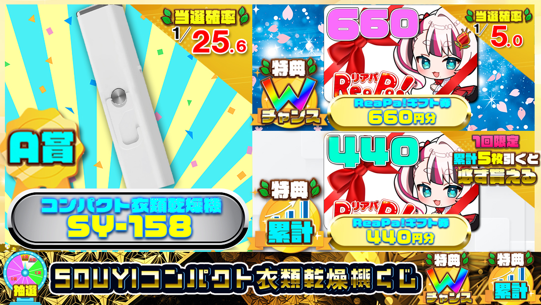 くじを引くごとに1/5で【ReaPa!ギフト券660円分】もGET出来るお得なWチャンス!!